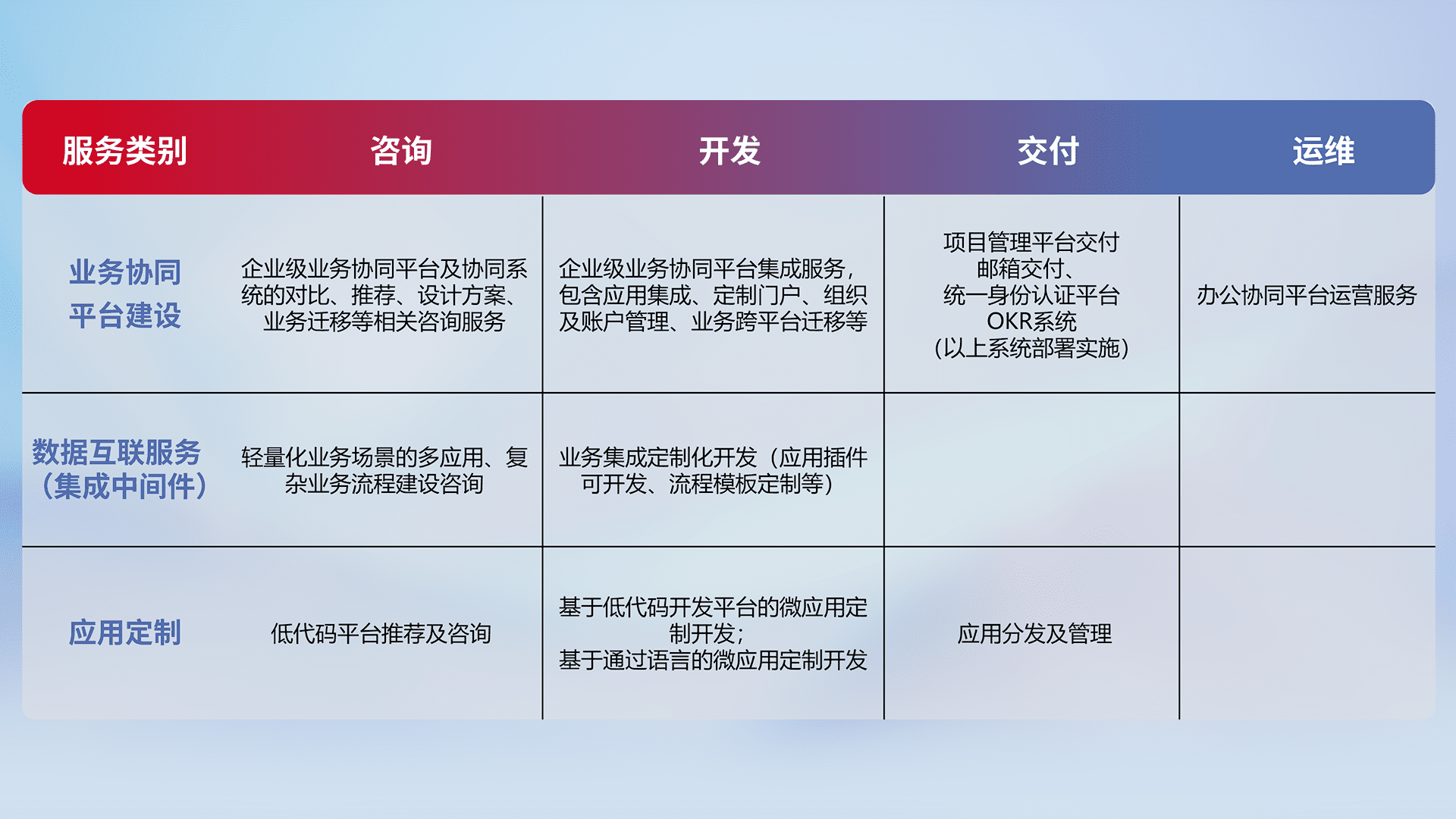 针对钉钉、、、、企微、、IDaas等平台级产品提供产品的规划、、方案、、、交付、、、定制化开发等服务,,实现如统一协同办公、、智能客户服务、、混合会议管理、、智能数据查询、、、、等业务场景,,实现数字化转型。。